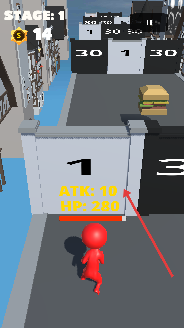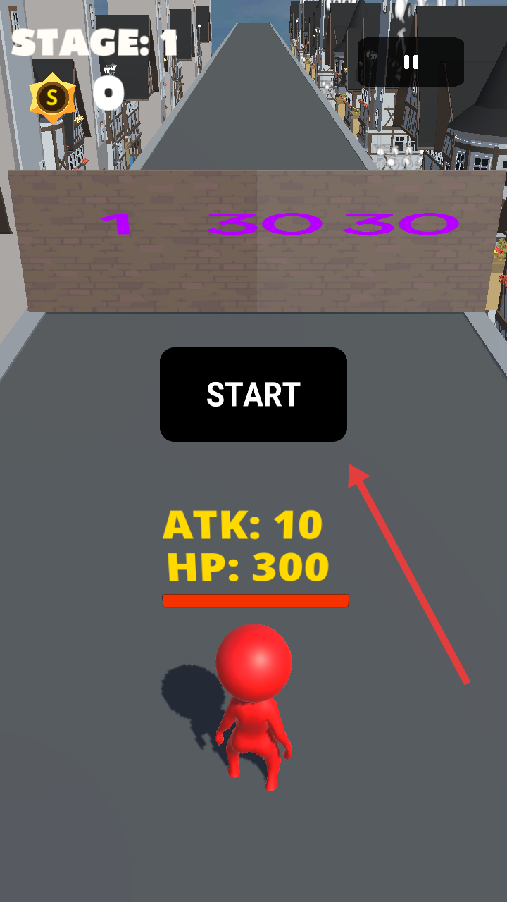 1、點(diǎn)擊START,進(jìn)入Stage1,操控紅色小人于城市跑道開(kāi)啟冒險(xiǎn),初始屬性ATK:10、HP:300。