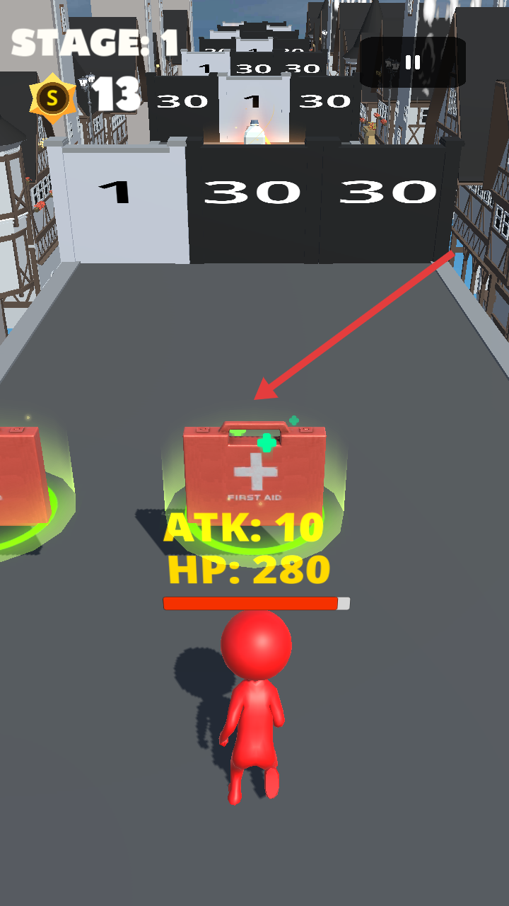 2、在跑道收集急救箱等道具提升HP,攻擊帶數(shù)字障礙物,數(shù)字對(duì)應(yīng)攻擊次數(shù),持續(xù)推進(jìn)關(guān)卡。