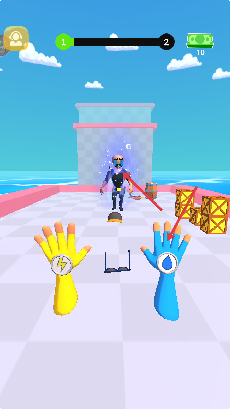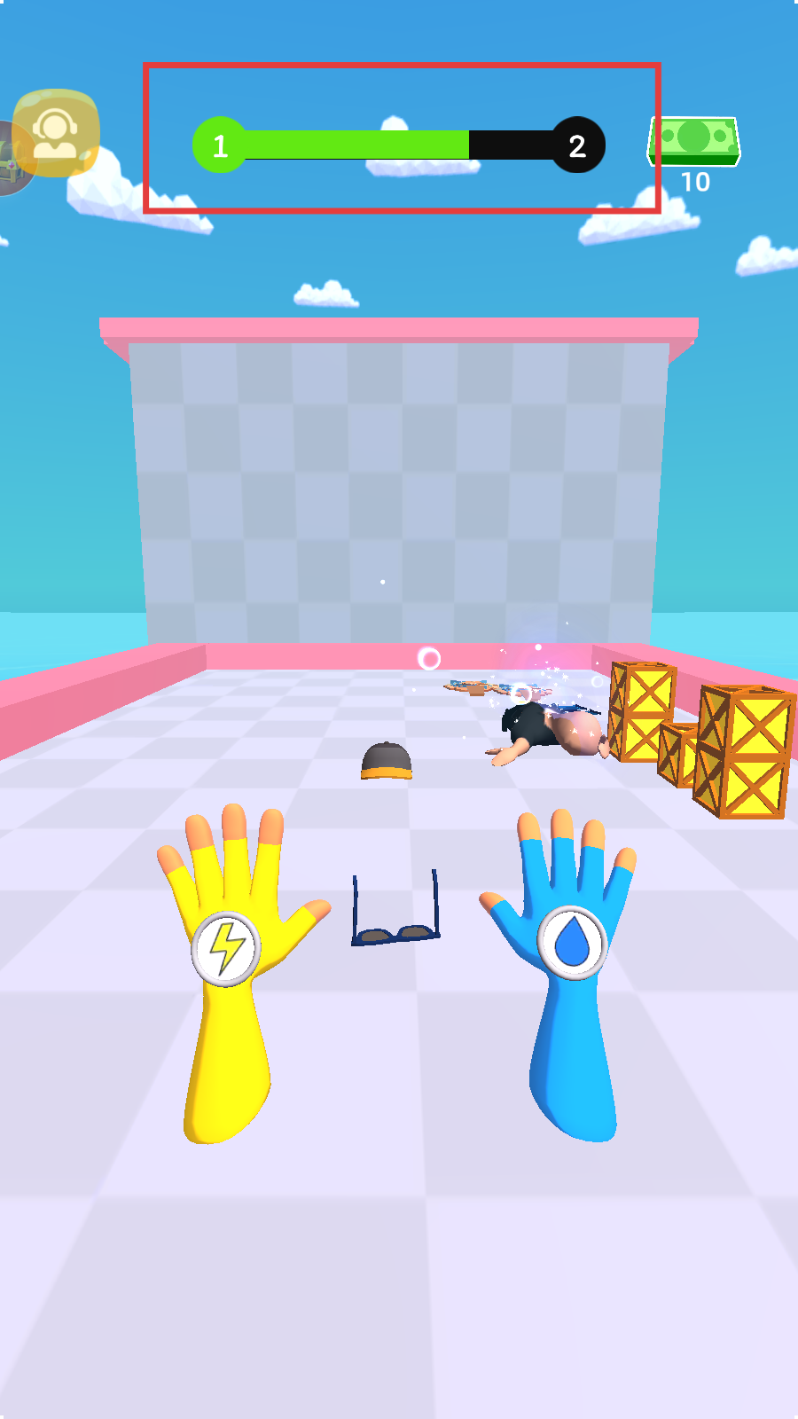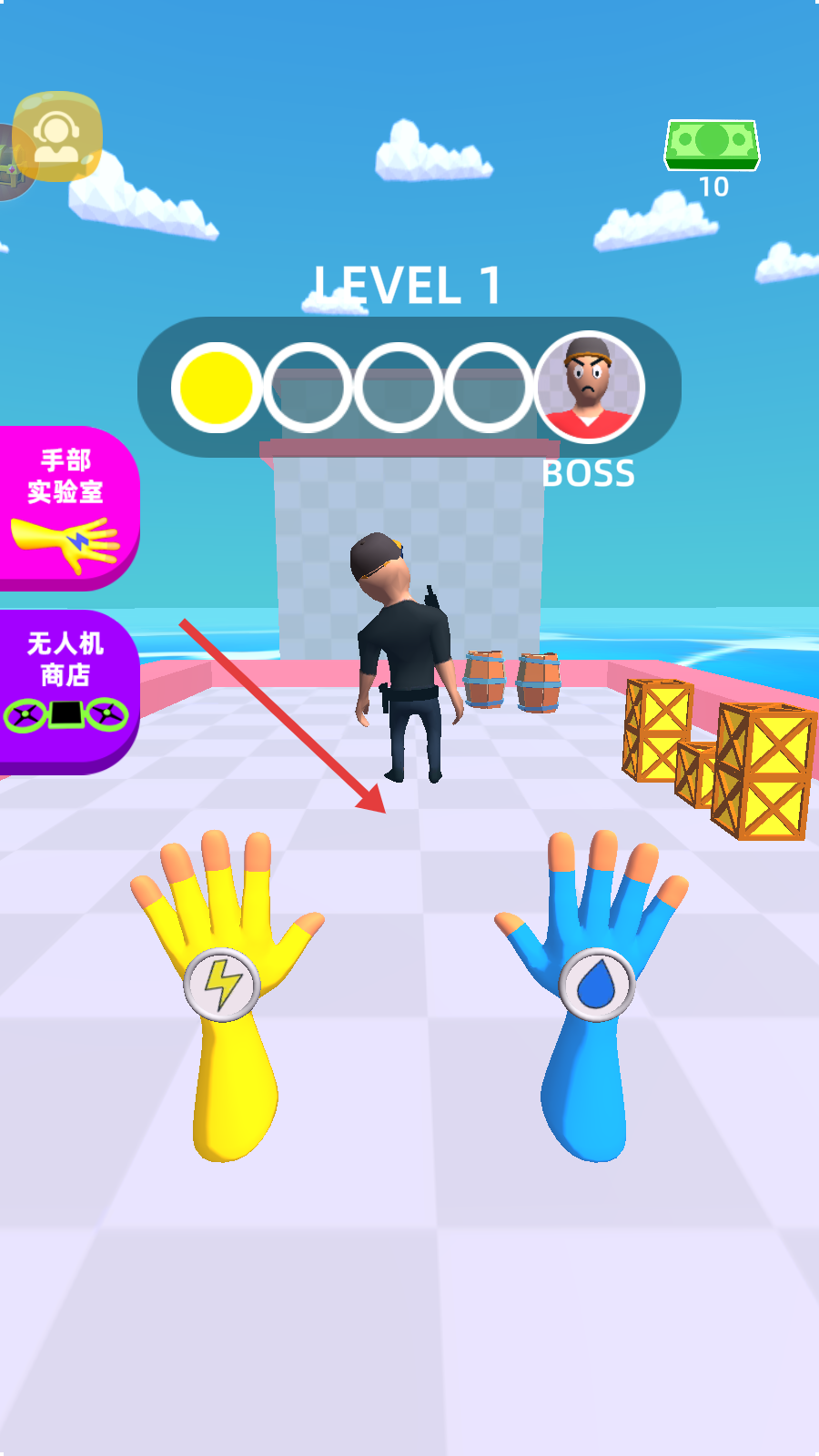 2、進(jìn)入【LEVEL1】關(guān)卡,可選擇黃色閃電手套或藍(lán)色水滴手套,攻擊前方的敵人。