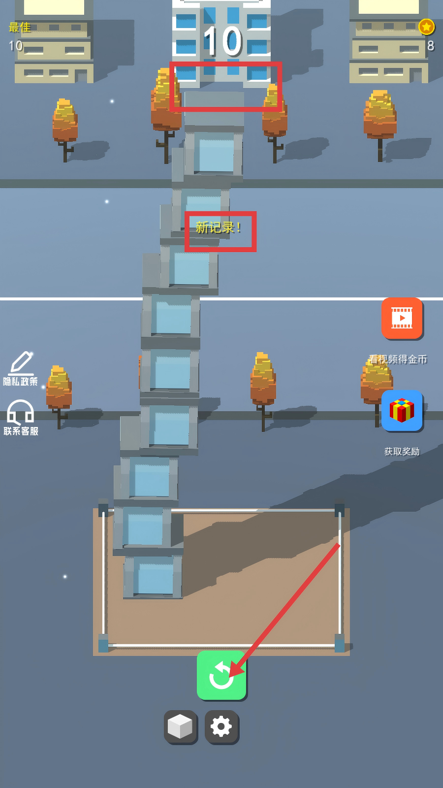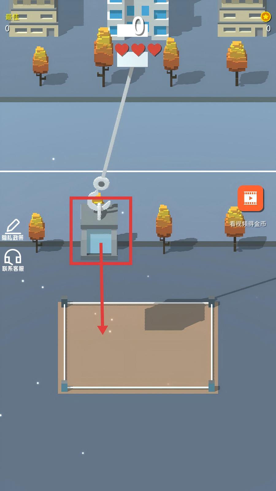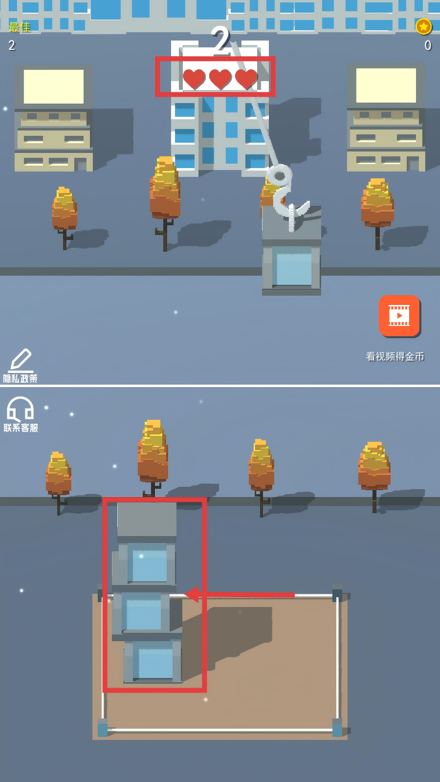 3、保持方塊堆疊的精準(zhǔn)度,利用上方的愛心次數(shù),逐步增加建筑的堆疊高度,積累分數(shù)。