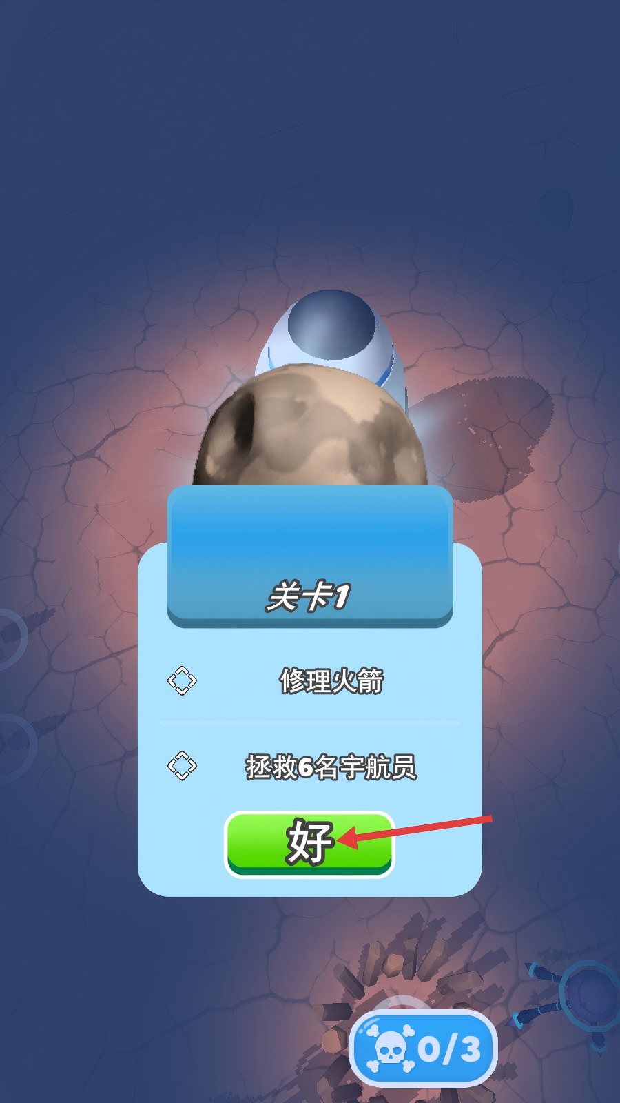 1、進(jìn)入【關(guān)卡1】,看到任務(wù)是【修理火箭】和【拯救6名宇航員】,點(diǎn)擊綠色【好】按鈕開始游戲。
