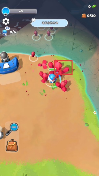 2、操控角色開采【紅色晶體】,積累資源,界面提示【延長您的生命】,同時留意收集進(jìn)度和背包容量。