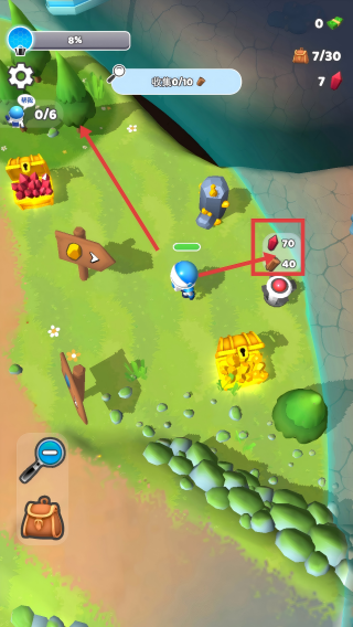 3、在地圖中收集資源,目標(biāo)是【收集0/10】指定物品,還能看到【晶體-70】【木材-40】的數(shù)量,前往對應(yīng)區(qū)域獲取。