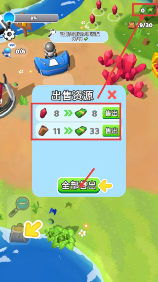 4、打開【出售資源】界面,可將【晶體-8】換【8】收益、【木材-11】換【33】收益,點(diǎn)擊【全部售出】快速變現(xiàn)。