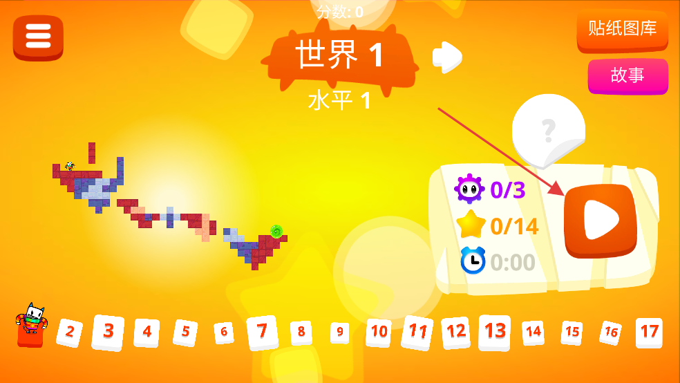 1、點(diǎn)擊橙色播放按鈕,進(jìn)入第一關(guān)開始冒險(xiǎn),準(zhǔn)備操控角色在色彩鮮艷的場(chǎng)景中行動(dòng)。