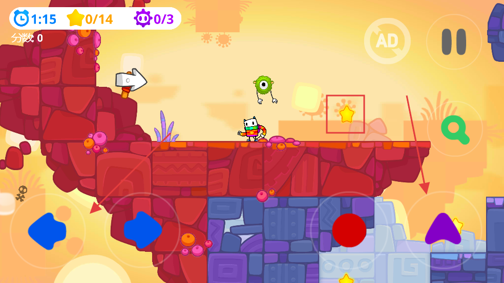2、進(jìn)入關(guān)卡后,利用下方藍(lán)色等按鈕控制角色移動(dòng),收集場(chǎng)景中的星星,向著終點(diǎn)前進(jìn)。