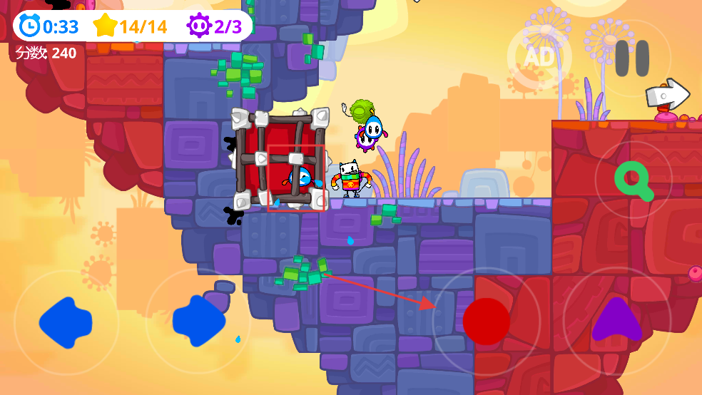 1、角色操控探索:通過(guò)滑動(dòng)屏幕調(diào)整彩虹小怪的移動(dòng)路徑,避開場(chǎng)景中的各類陷阱,利用物理互動(dòng)元素開辟前進(jìn)道路。