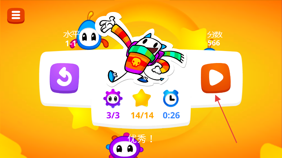 4、關(guān)卡完成后,界面顯示收集的齒輪、星星數(shù)量及用時(shí)等,若想繼續(xù)挑戰(zhàn),點(diǎn)擊橙色播放按鈕,即可進(jìn)入下一段冒險(xiǎn)。