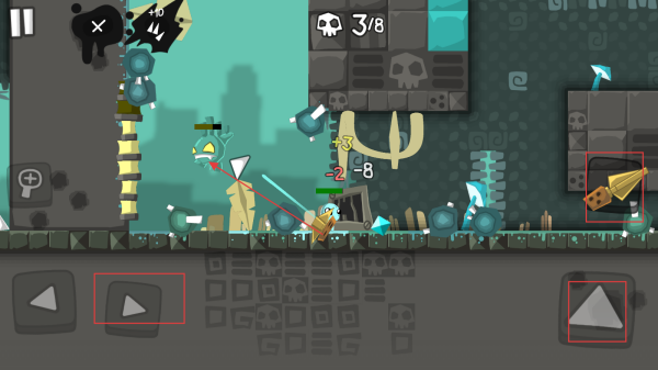 3、遇到綠色怪物,使用攻擊等操作對(duì)抗,同時(shí)利用移動(dòng)和跳躍按鈕,躲避怪物攻擊,積累擊殺數(shù)。