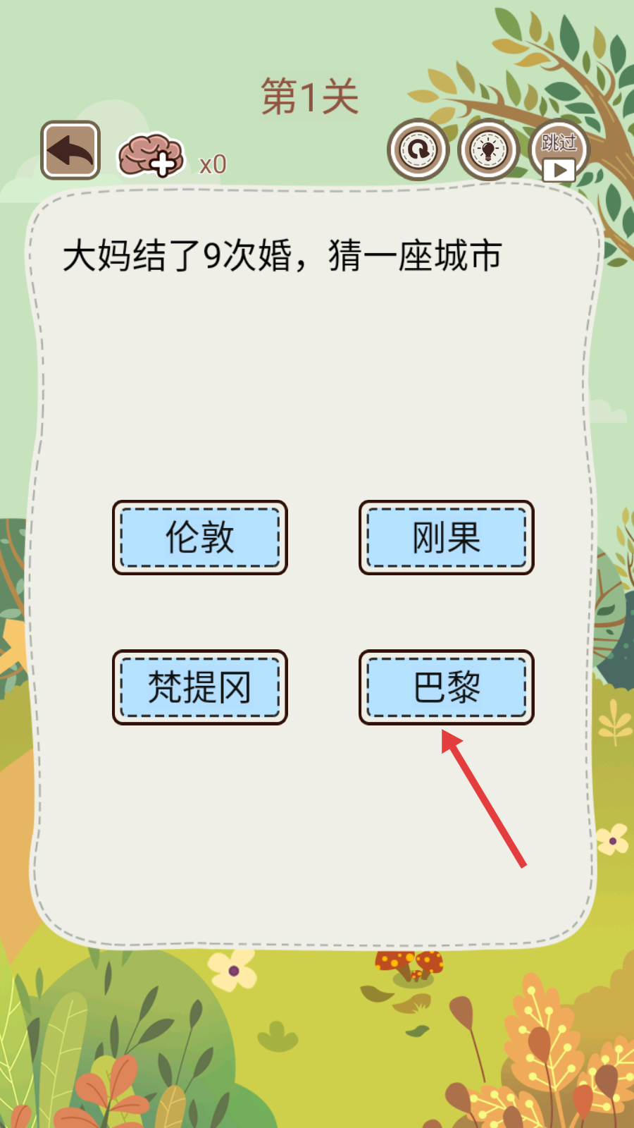3、第1關(guān)的題目是【大媽結(jié)了9次婚,猜一座城市】,我們要選擇【巴黎】這個選項,因為【八離】諧音很契合題意哦。
