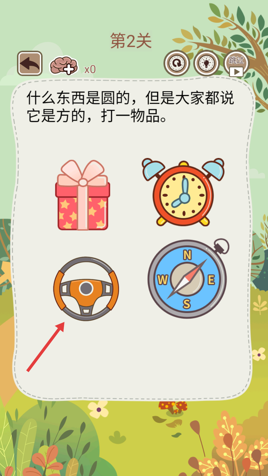 4、到了第2關(guān),題目是【什么東西是圓的,但是大家都說它是方的,打一物品】,我們選擇【方向盤】,這樣就能順利通過第二關(guān)啦。