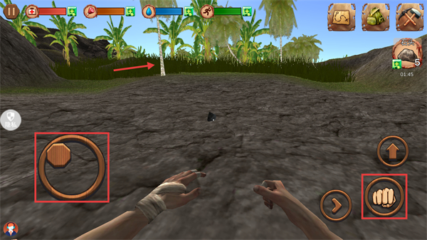 1、我們可以通過左側(cè)搖桿移動(dòng)角色,靠近資源后,點(diǎn)擊右側(cè)【拳頭】按鈕進(jìn)行互動(dòng)獲取呢。