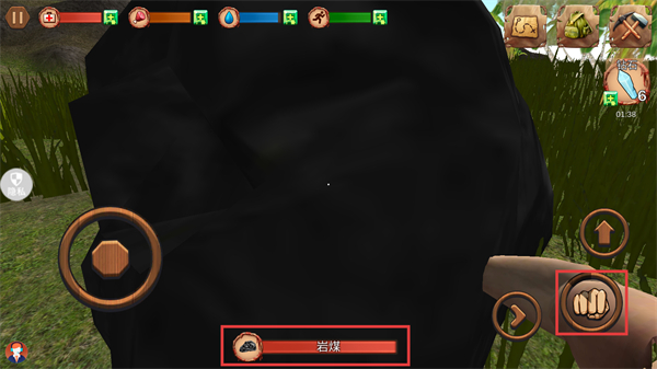 2、看到【巖煤】這類資源時(shí),靠近后點(diǎn)擊右側(cè)【拳頭】按鈕,就能開始采集,積累資源用于后續(xù)制作啦。