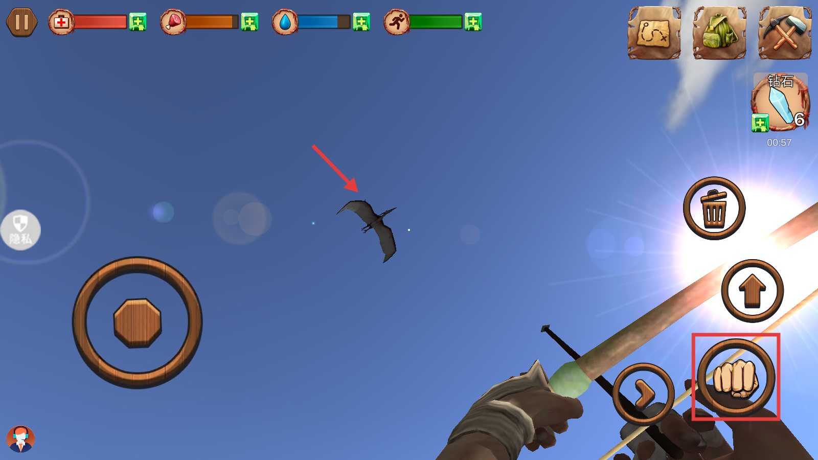 4、遇到空中的翼龍,我們切換出【弓箭】,瞄準(zhǔn)后點(diǎn)擊右側(cè)【拳頭】按鈕發(fā)射,就能攻擊翼龍啦。