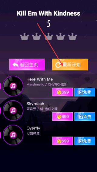 4、若游戲未達(dá)到理想效果,可點(diǎn)擊【重新開始】,再次挑戰(zhàn)該歌曲,提升游戲表現(xiàn)。
