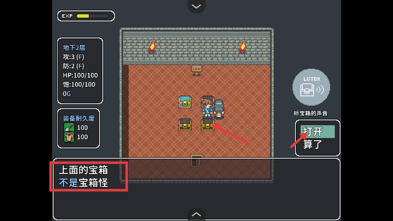 2、在地下2層,看到寶箱時(shí),先留意提示,確認(rèn)【上面的寶箱-不是寶箱怪】后,點(diǎn)擊【打開(kāi)】,獲取可能的道具。