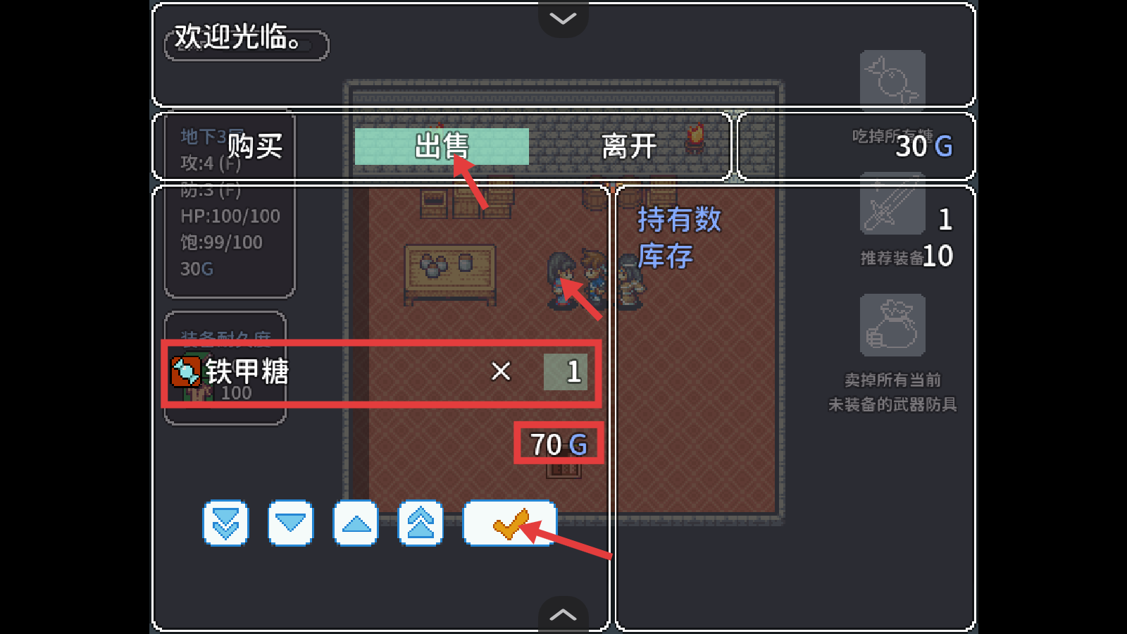 4、到商店后,切換到【出售】界面,若有多余的【鐵甲糖】,可將其出售,能獲得70G的收益。