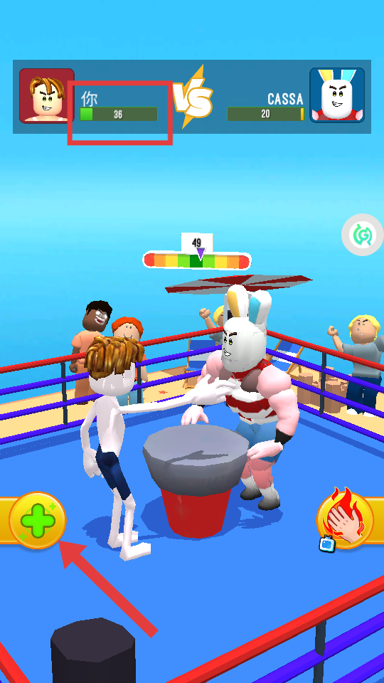 3、對(duì)戰(zhàn)時(shí)密切關(guān)注屏幕上方【你】的血量條,當(dāng)血量低時(shí),點(diǎn)擊左下角【加號(hào)按鈕】補(bǔ)充狀態(tài)。