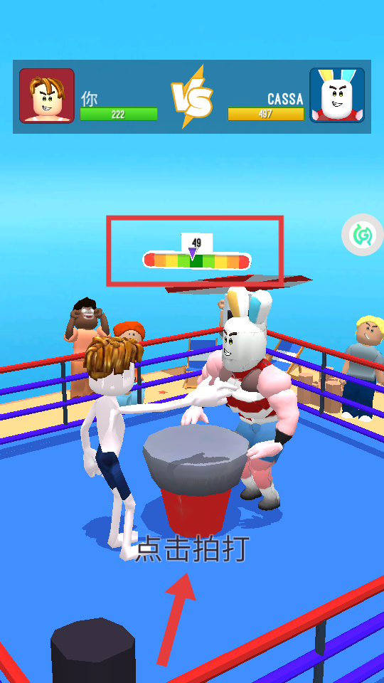 2、進(jìn)入對(duì)戰(zhàn)場(chǎng)景,觀看上方數(shù)值條,當(dāng)指針到達(dá)中心【49】最大力度后,按照【點(diǎn)擊拍打】提示,快速點(diǎn)擊屏幕攻擊對(duì)手。
