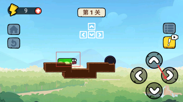 2、進入【第1關(guān)】,操控綠色長條角色,利用右側(cè)方向按鍵,調(diào)整角色移動方向,在平臺上移動探索。