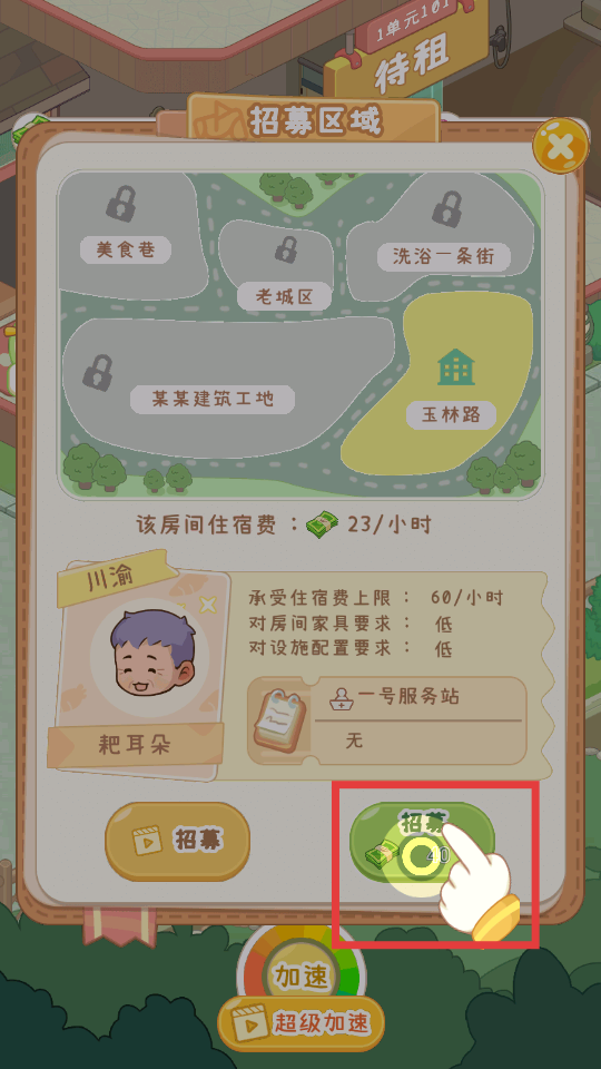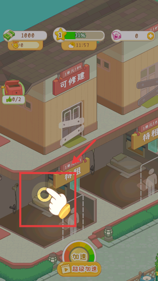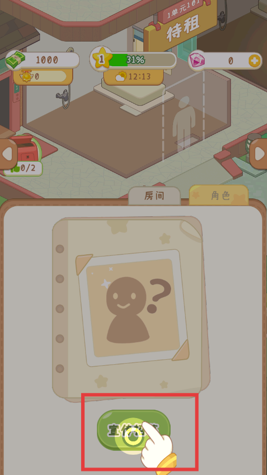 1、游戲開局,點(diǎn)擊標(biāo)注“待租”的房間。