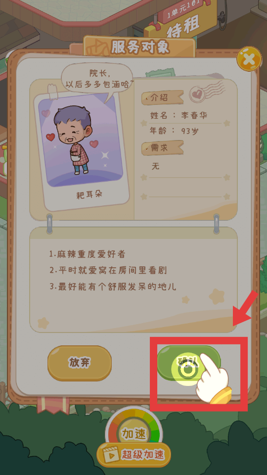 3、初始指引跟隨:等待游戲加載完畢后進(jìn)入經(jīng)營界面,先跟隨NPC指引熟悉操作,比如了解設(shè)施建造流程、老人入住規(guī)則,快速掌握基礎(chǔ)步驟。