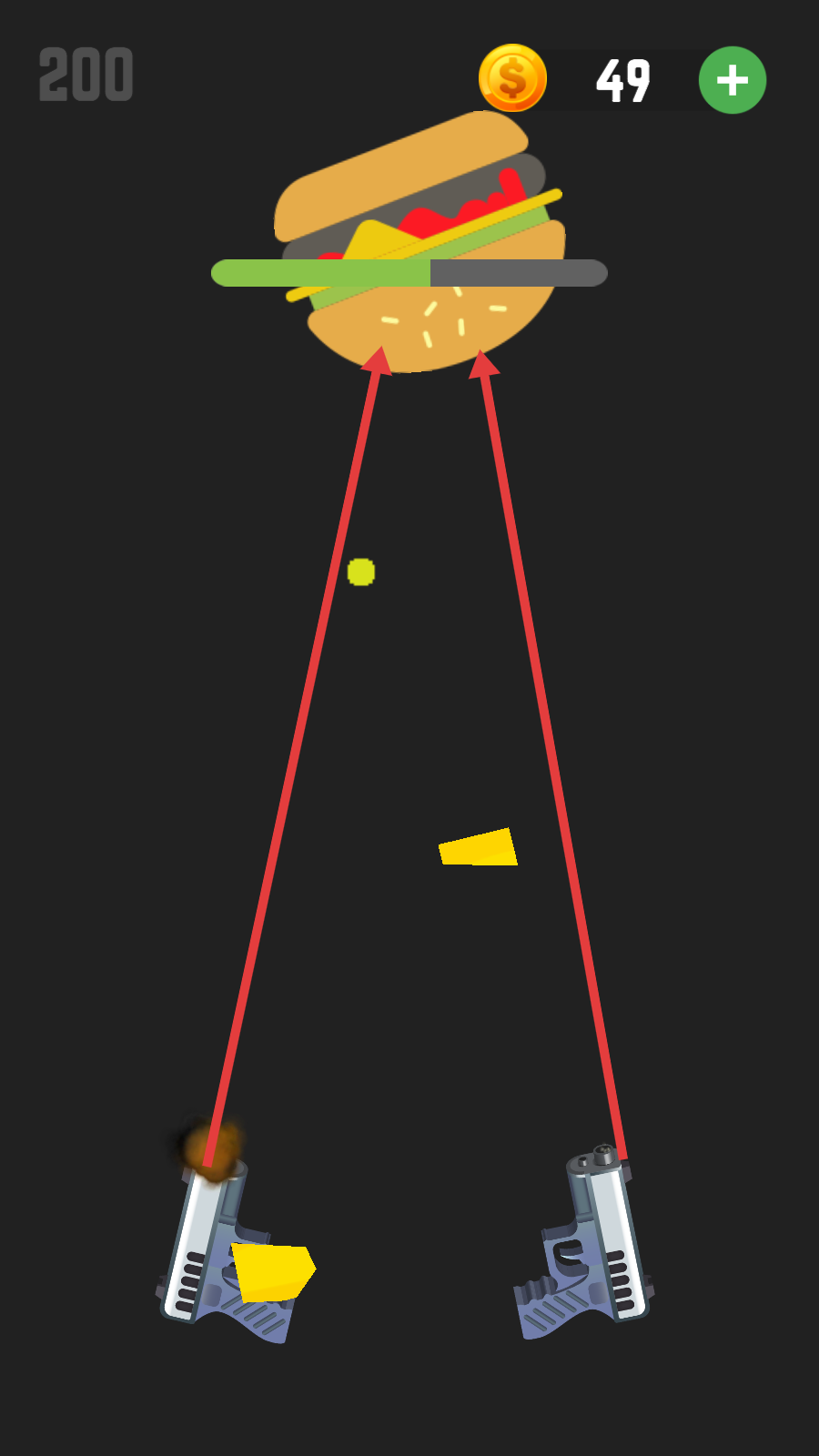 3、遇到漢堡等更大目標(biāo)時(shí),利用雙槍同時(shí)射擊,更快削減目標(biāo)進(jìn)度,高效獲取金幣,提升射擊收益。