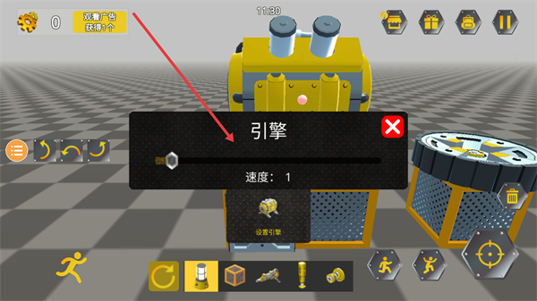 4、在“引擎”設(shè)置界面,調(diào)節(jié)【速度】參數(shù),完成機(jī)械組件的屬性設(shè)置,使搭建物可運(yùn)轉(zhuǎn)。