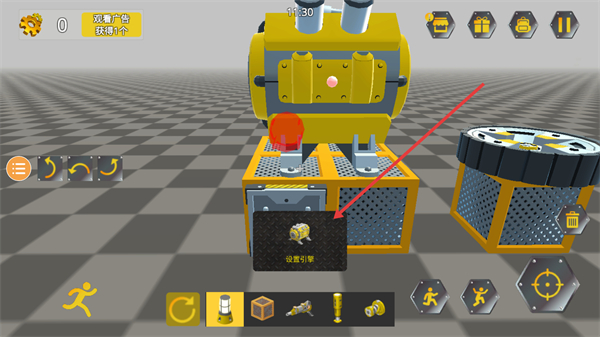 3、添加黃色機(jī)械裝置到搭建結(jié)構(gòu),點(diǎn)擊裝置彈出的【設(shè)置引擎】選項(xiàng)。