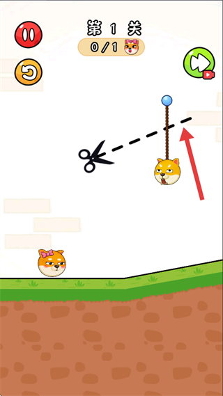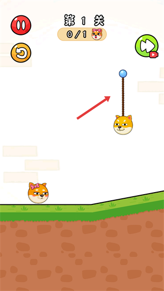 2、進(jìn)入【第1關(guān)】后,觀察場(chǎng)景中懸掛著的狗頭以及上方的藍(lán)色圓球,準(zhǔn)備進(jìn)行切割操作。