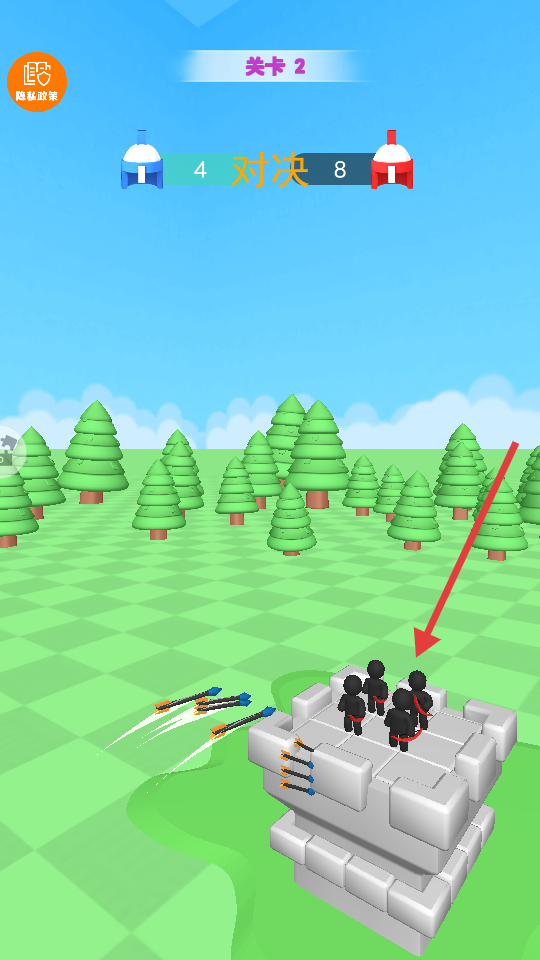 3、瞄準敵方陣地的黑色小人,集中發(fā)射箭矢削減敵方人數(shù),注意箭的軌跡確保命中目標。