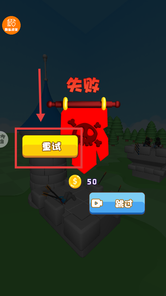 4、戰(zhàn)斗失敗后點擊【重試】按鈕重新挑戰(zhàn),調(diào)整射擊策略,優(yōu)化角度與力量,爭取擊敗敵人。
