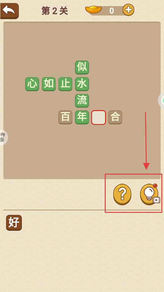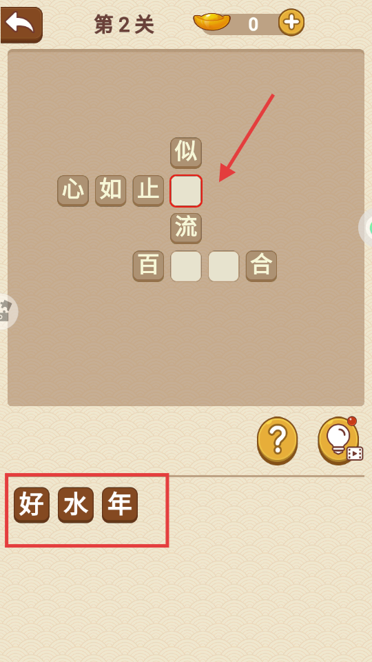 2、第2關(guān)需填成語,從下方【好】【水】【年】中選字,結(jié)合【心如止-流】結(jié)構(gòu)填字。
