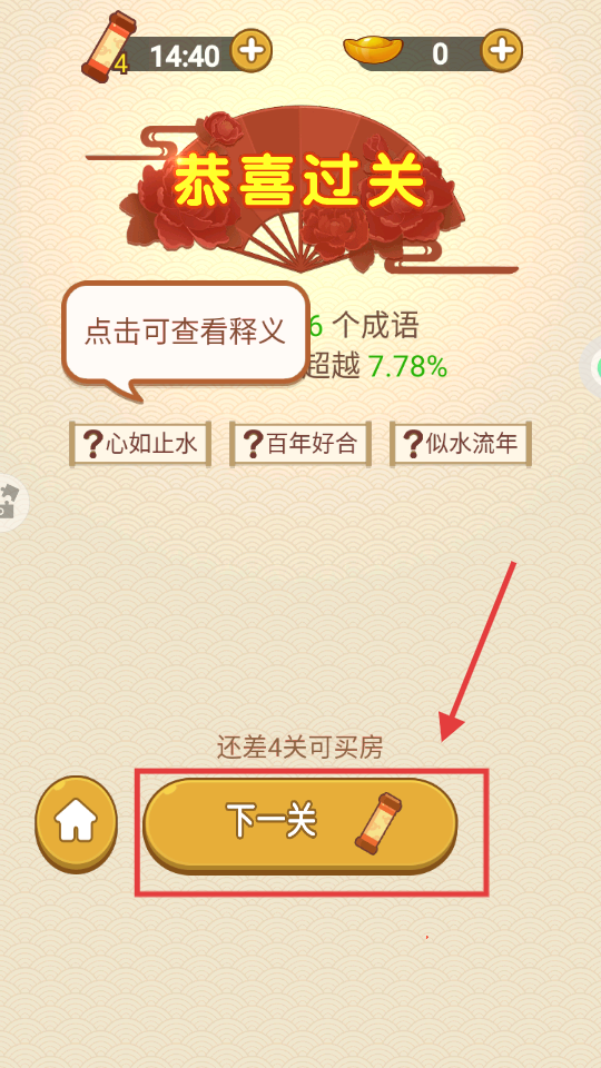 4、過關(guān)后點擊【下一關(guān)】按鈕,繼續(xù)挑戰(zhàn)更高難度字謎,積累過關(guān)進度。