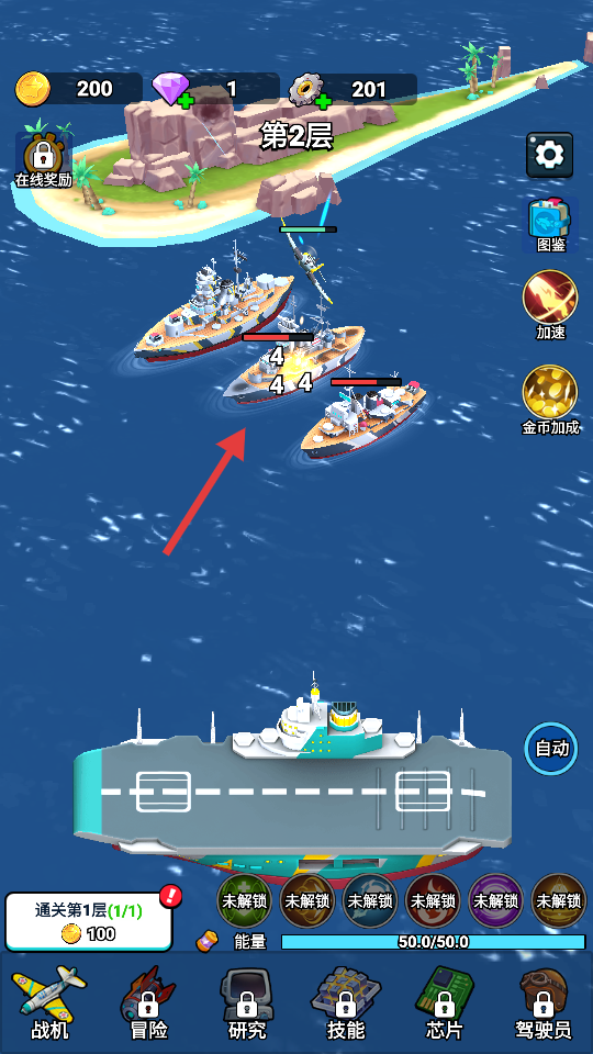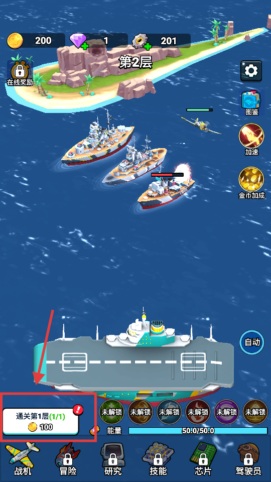 1、完成【通關(guān)第1層(1/1)】后,及時(shí)領(lǐng)取【100】金幣獎(jiǎng)勵(lì),積累資源用于解鎖或升級(jí)戰(zhàn)艦。