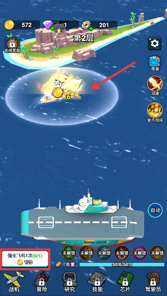 3、完成【強(qiáng)化飛機(jī)1次(0/1)】任務(wù),領(lǐng)取【120】金幣,擊敗敵艦獲取金幣,強(qiáng)化戰(zhàn)機(jī)增強(qiáng)戰(zhàn)力。