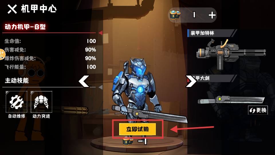 3、在【機(jī)甲中心】選【動力機(jī)甲-?型】,點(diǎn)擊【立即試用】,體驗(yàn)機(jī)甲增強(qiáng)戰(zhàn)力。