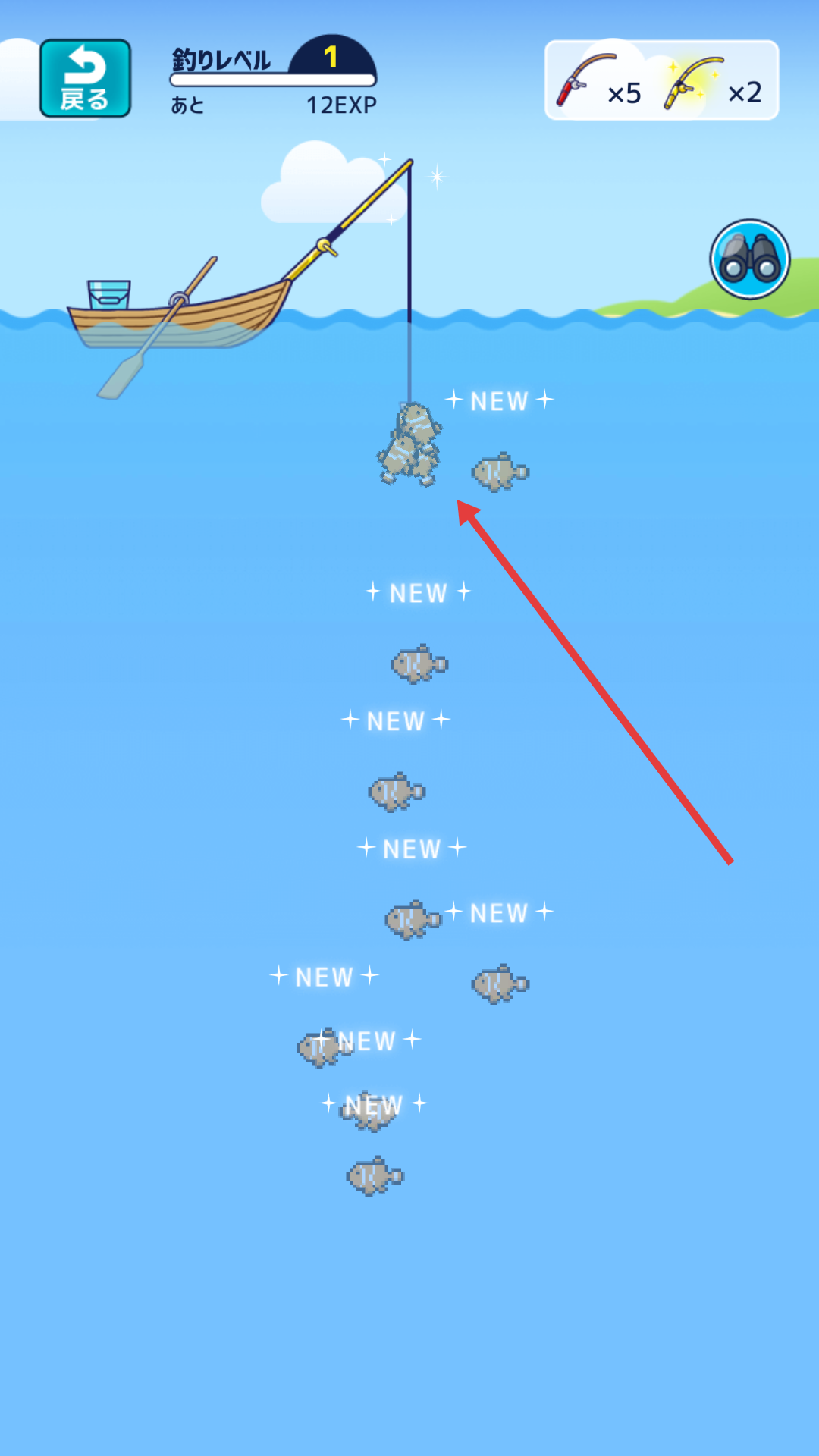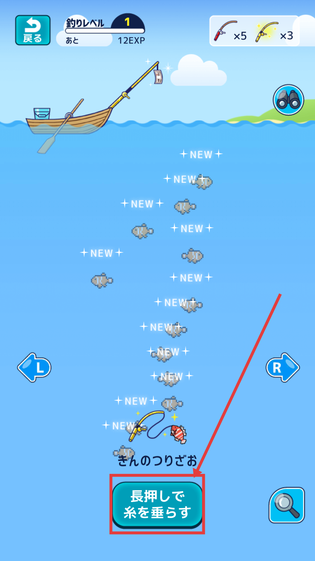 3、在釣魚(yú)界面,長(zhǎng)按按鈕,使魚(yú)線(xiàn)垂入水中。