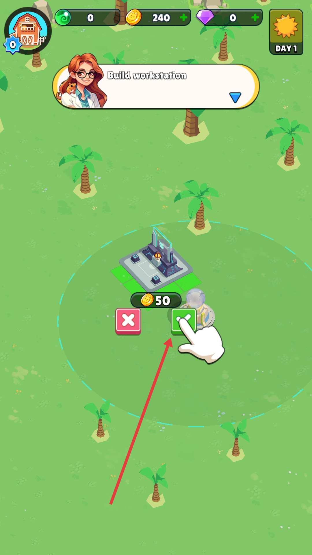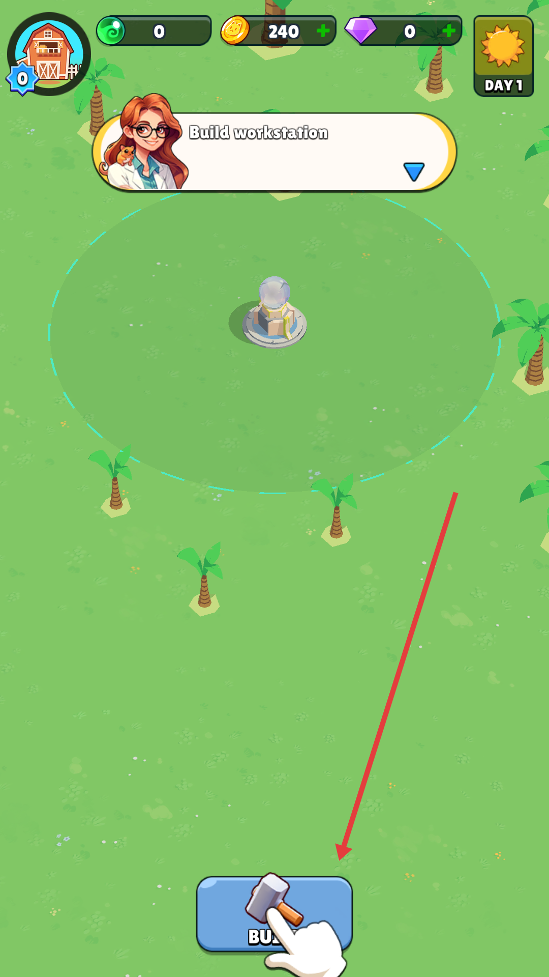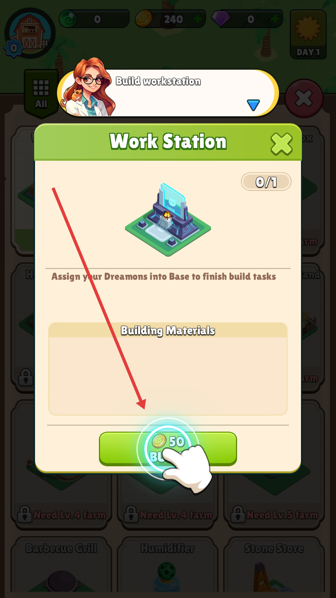 3、點擊綠色的【BUILD】按鈕,花費50金幣,開始建造工作站。