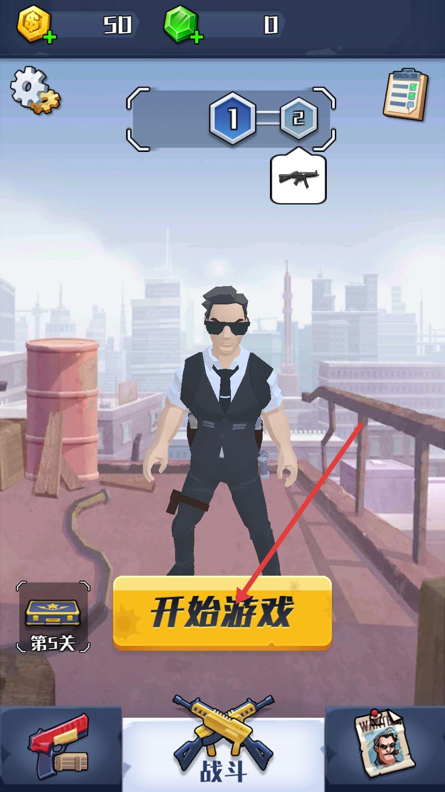 1、點擊【開始游戲】按鈕進入關(guān)卡,可查看初始金幣、武器等信息,隨后開啟戰(zhàn)斗,熟悉游戲基礎(chǔ)界面與操作。