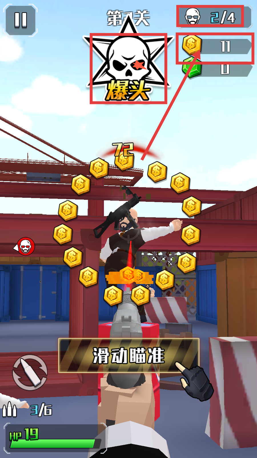 3、射擊時嘗試【滑動瞄準(zhǔn)】,若擊中敵人頭部觸發(fā)【爆頭】,能獲取更多金幣,同時關(guān)注剩余敵人數(shù)量與金幣累計情況。