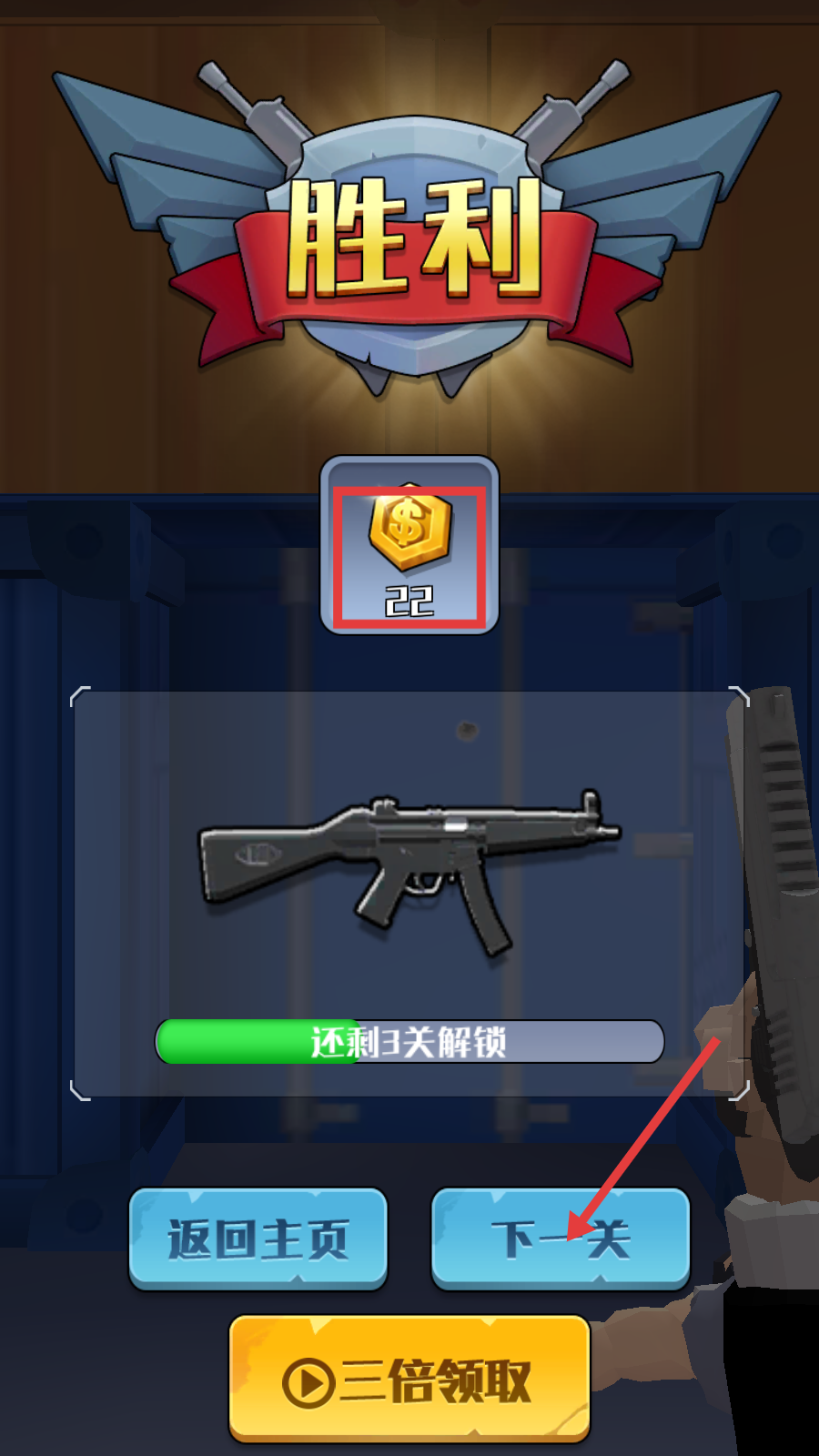 4、消滅所有敵人后,界面顯示【勝利】,可領(lǐng)取金幣獎勵,還能解鎖新武器,點擊【下一關(guān)】挑戰(zhàn)后續(xù)關(guān)卡。