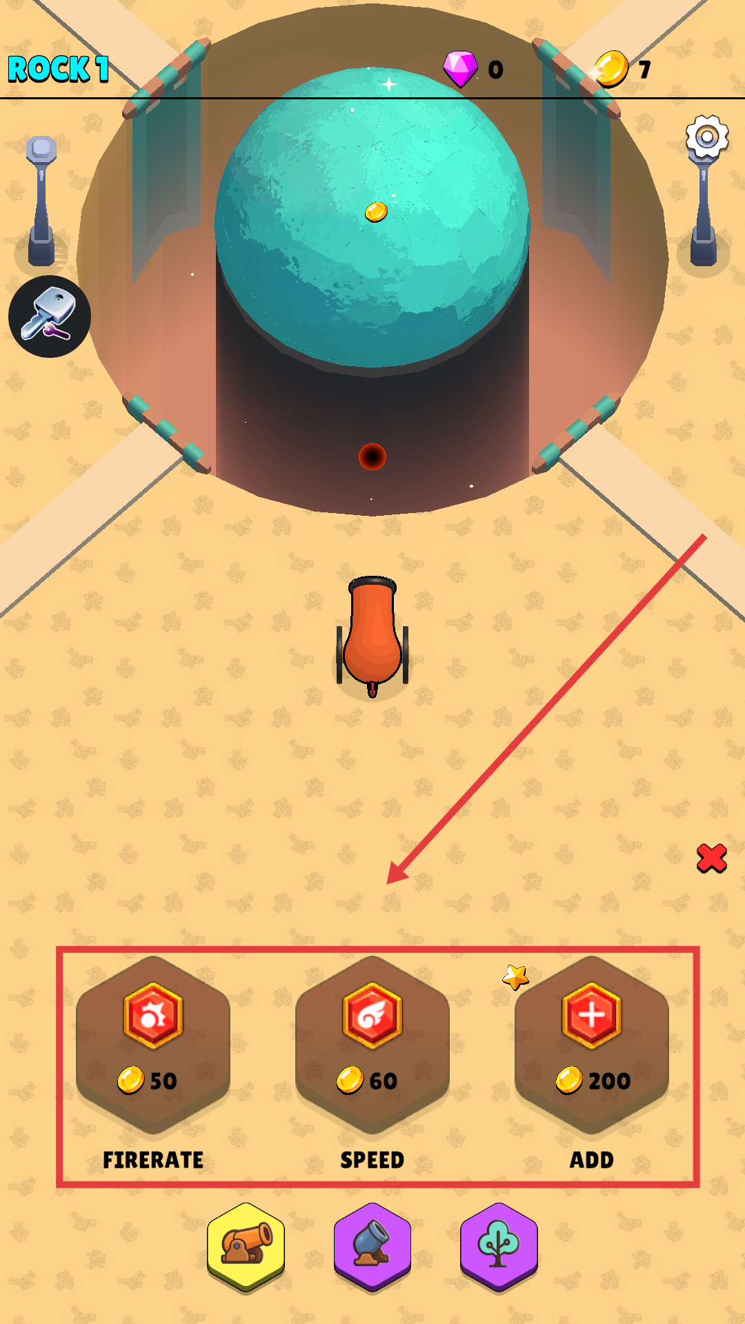 4、依據(jù)自身需求,從下方【FIRERATE】【SPEED】【ADD】等強(qiáng)化選項(xiàng)中選擇,使用金幣來提升炮臺(tái)的屬性。