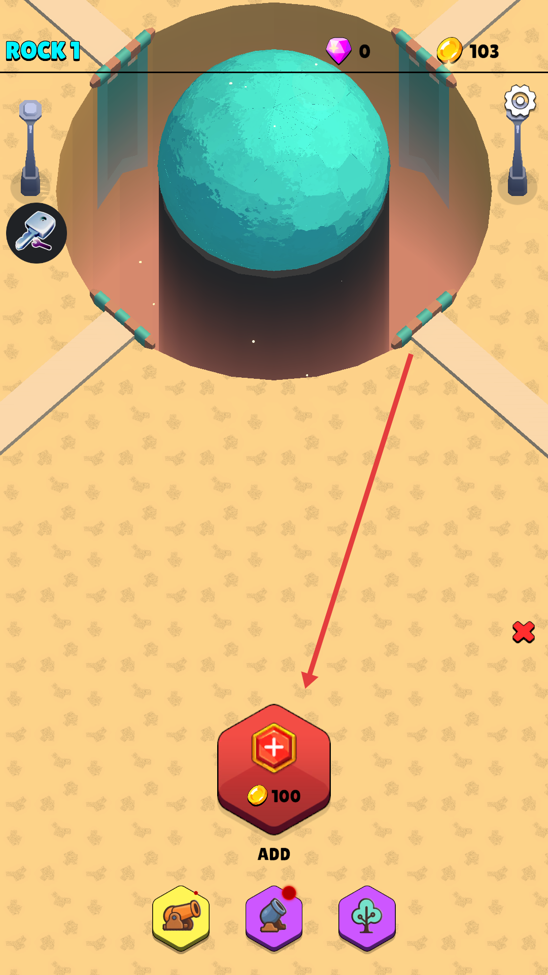 3、消耗100金幣,點(diǎn)擊紅色六邊形且?guī)в小?”符號(hào)的【ADD】按鈕,添加新的炮臺(tái)或相關(guān)功能。