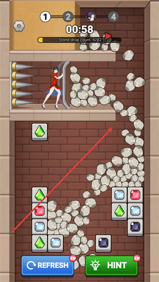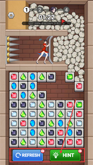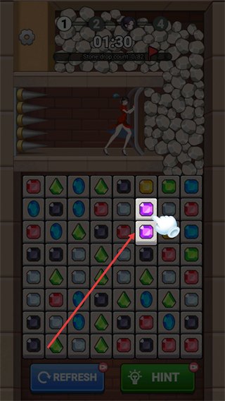 3、持續(xù)消除寶石,讓上方的石塊不斷掉落,為角色開辟通道。