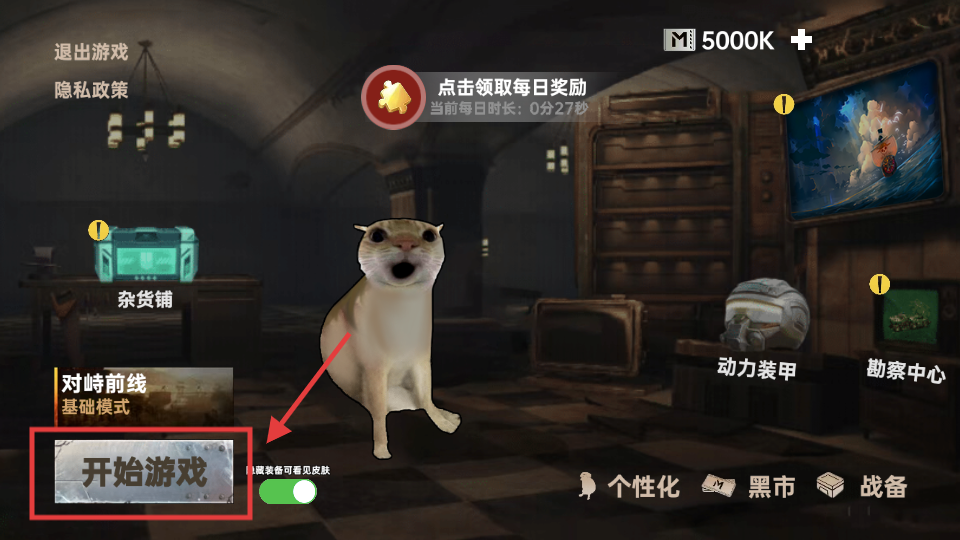 1、點(diǎn)擊【開始游戲】進(jìn)入【對峙前線】-【基礎(chǔ)模式】,準(zhǔn)備尋找裝備武器,搶占輸出位。