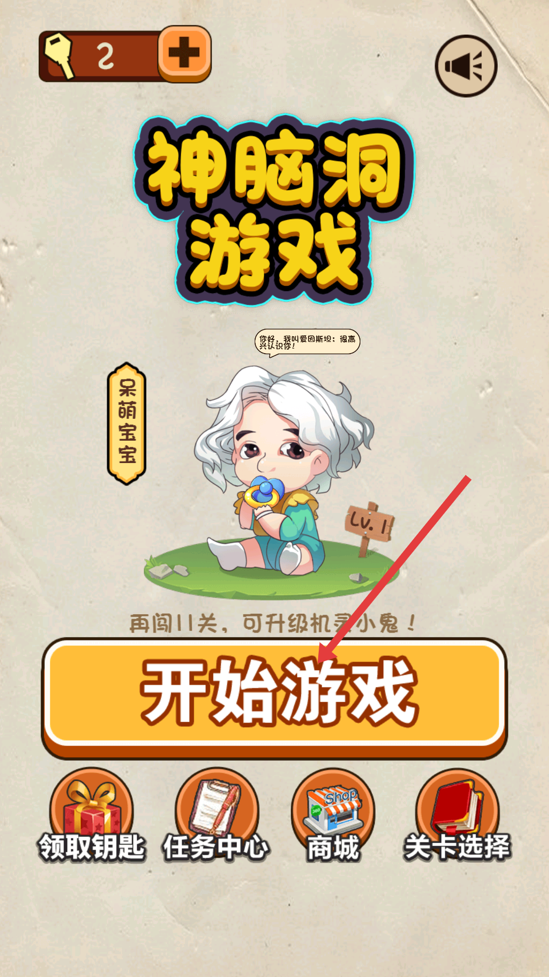 1、當(dāng)前角色為呆萌寶寶,點(diǎn)擊【開始游戲】按鈕開啟關(guān)卡挑戰(zhàn),進(jìn)入《神腦洞游戲》。