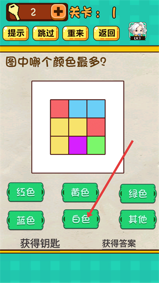 2、在關(guān)卡1,遇到“圖中哪個顏色最多?”的問題,選擇【白色】選項(xiàng),就能完成該關(guān)卡。