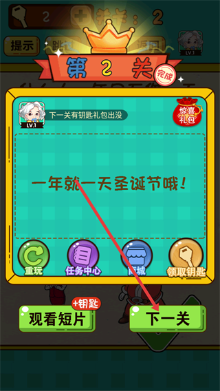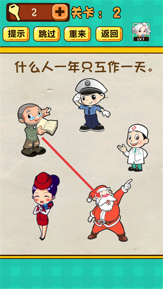 3、到關(guān)卡2,針對“什么人一年只工作一天”的問題,點(diǎn)擊圣誕老人形象,可完成關(guān)卡挑戰(zhàn)。