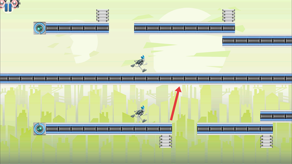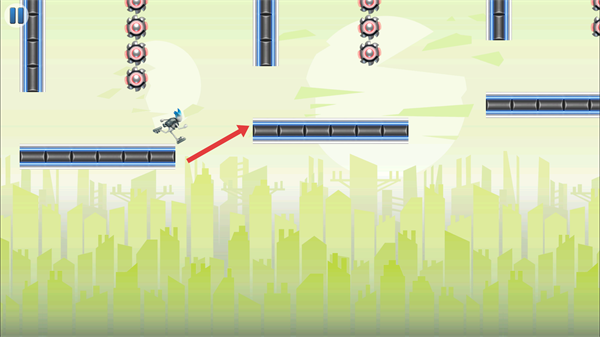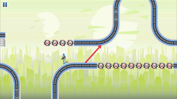 2、操控角色沿軌道移動(dòng),注意避開齒輪類障礙,點(diǎn)擊空格鍵,讓角色切換軌道奔跑,沿著箭頭指引的軌道方向前進(jìn)。